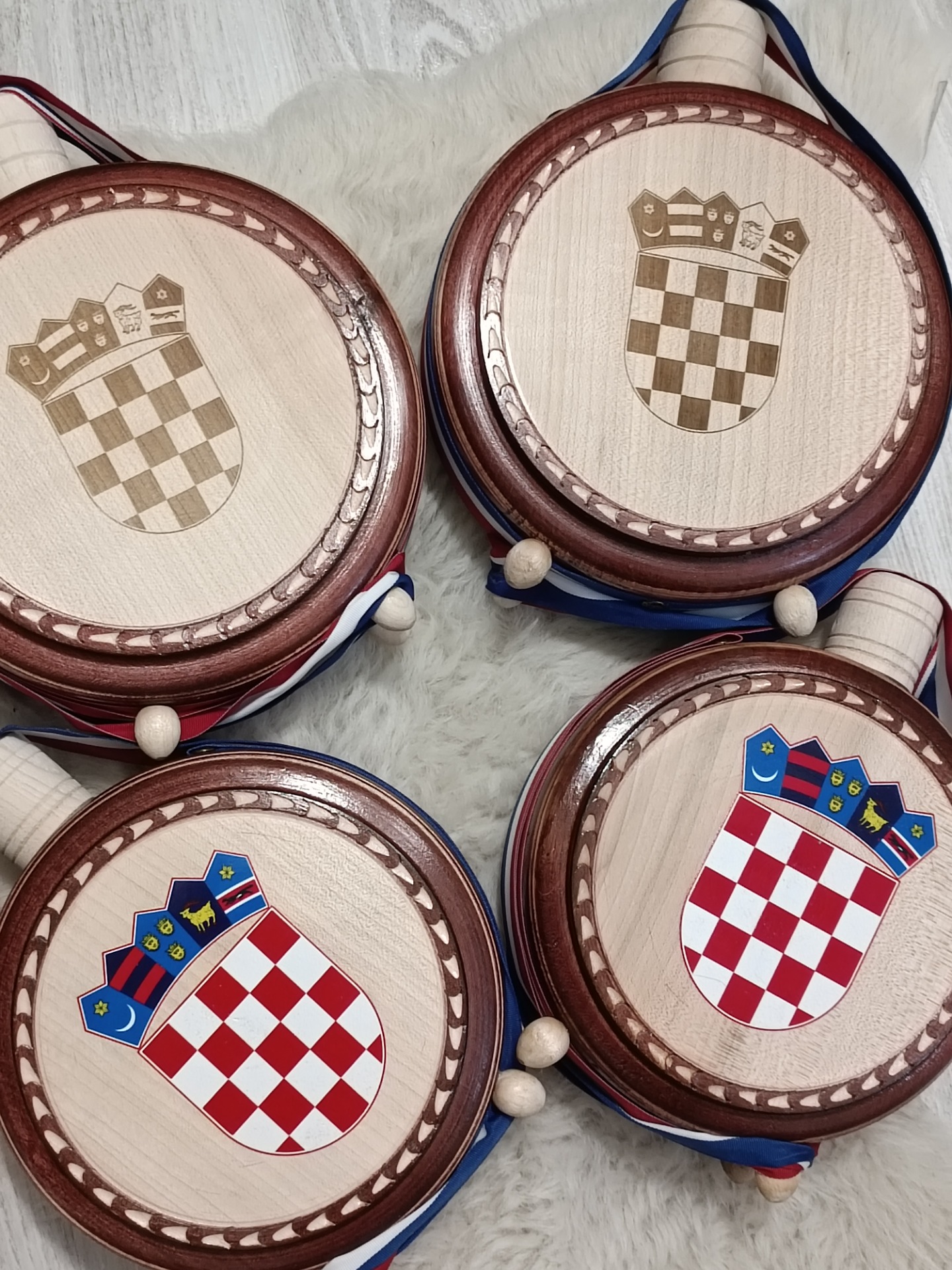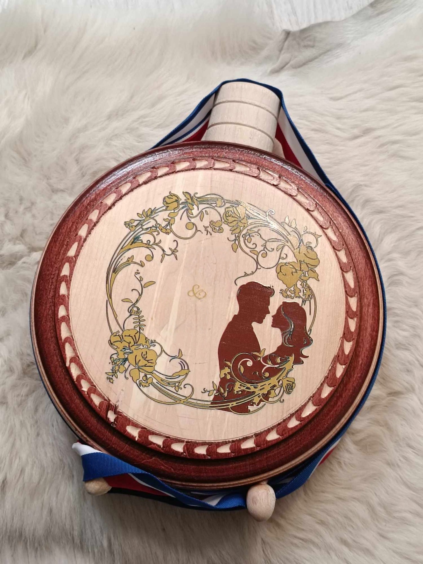 Feldflasche aus Holz, die auf keiner kroatischen Hochzeit fehlen darf. Geschenkidee mit eingravierten Namen, Datum oder Text nach Wunsch. Eine Seite zeigt ein Ehepaar und die gewünschten Namen oder Text, die andere Seite das kroatische Wappen oder ein anderes gewünschtes Motiv. Beidseitige Gravur ist möglich; der Preis richtet sich dann danach. Lieferzeit ca. ein Monat. Einheitsgröße. Versandkosten sind nicht im Preis enthalten.