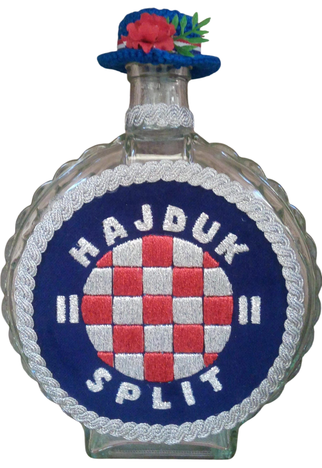 Flasche dekoriert mit Goldstickerei und einem Hut der Tracht der Region Slawonien als besonderes Element. Viele Motive möglich, die Sie uns im Bestellformular gerne mitteilen können.