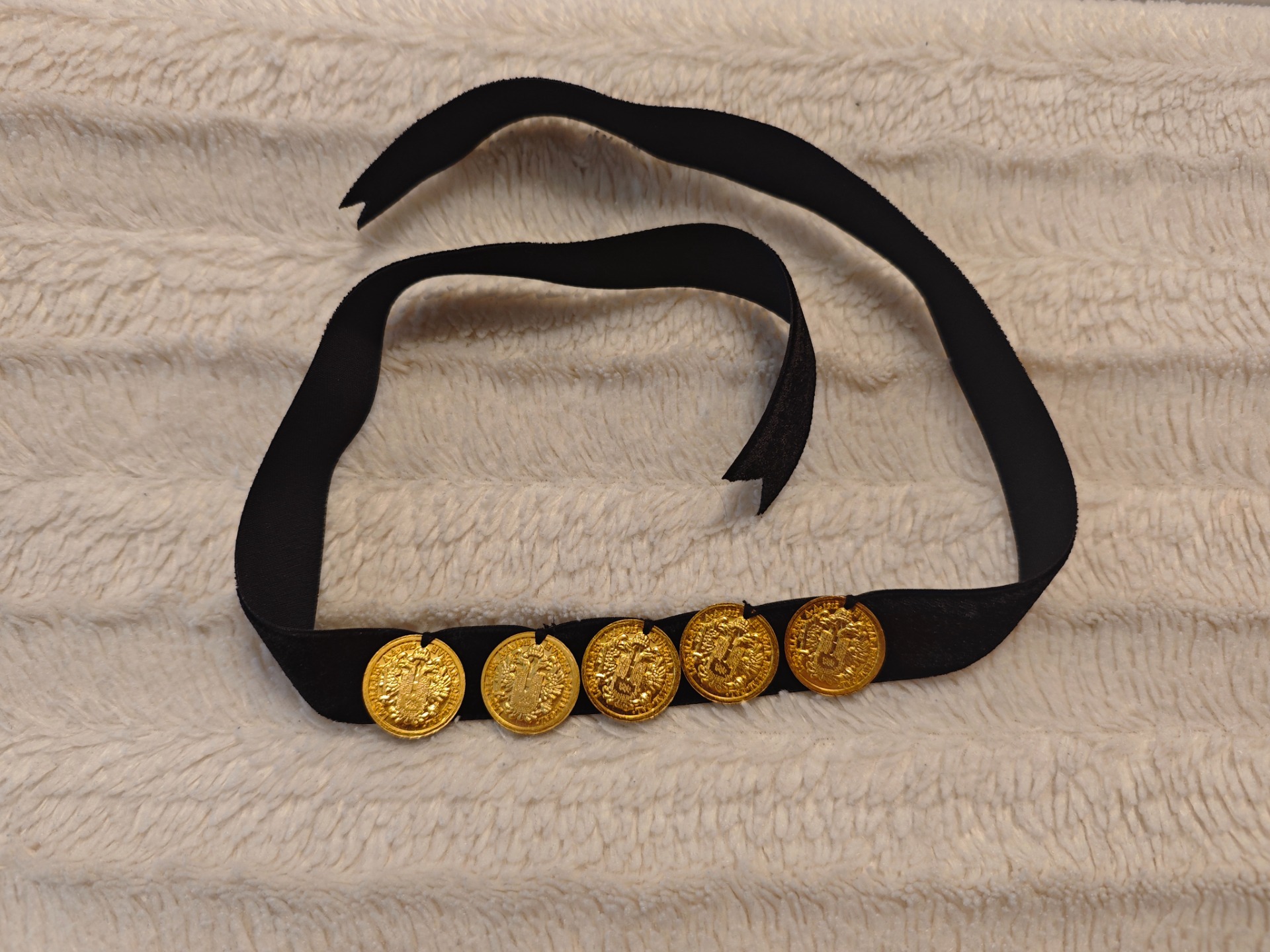 Halskette auf Plüsch mit 5 Dukaten. Die Dukaten sind nicht echt. Einheitsgröße. Preis ohne Versandkosten.