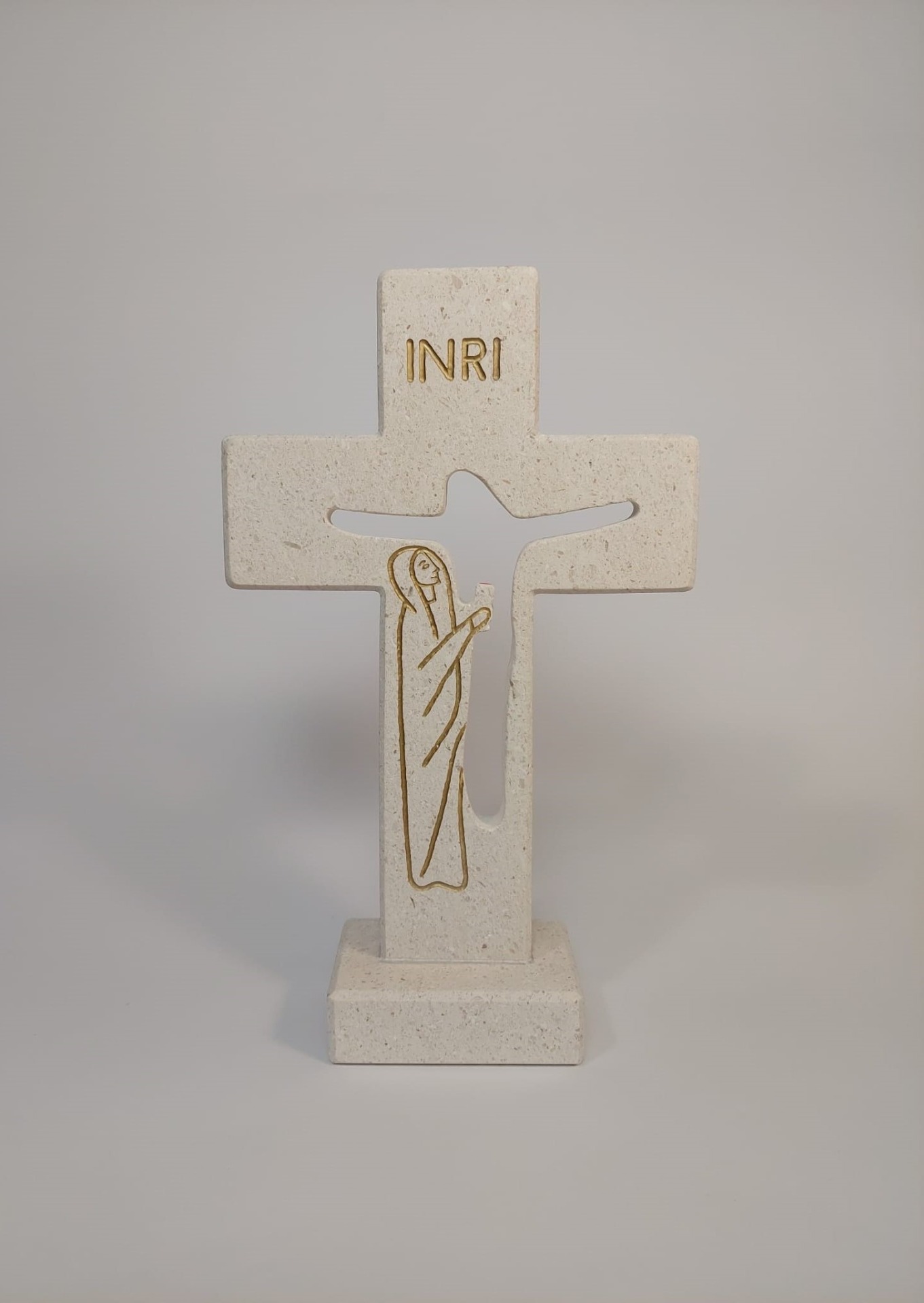 Križ od bračkog kamena na postolju. "Križ jedinstva" predstavlja duboko jedinstvo Marije s Isusom, te prikazuje njezinu patnju kao Majka sjedinjenu s patnjom svoga Sina na križu. Dimenzije: 29 × 18 × 7 cm. Napomena: Radi opsežnog rada potrebnog za ovaj proizvod, isporuka se čeka oko mjesec dana. Poštarina nije u cijeni.