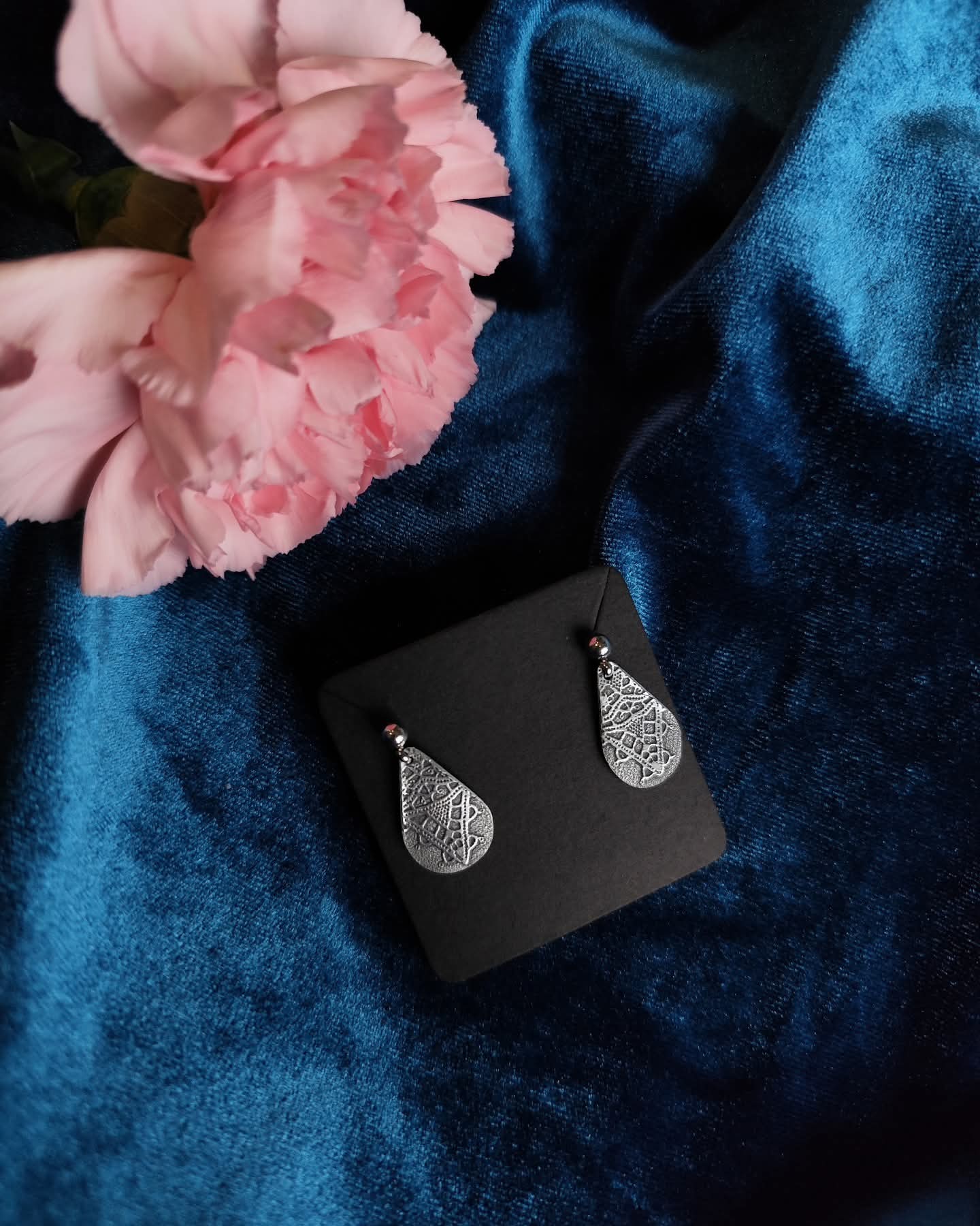 Naušnice s motivom paške čipke izrađene specijalnom tehnikom sa slanom vodom (more) i električnom strujom. Materijal je visokokvalitetan aluminij 99,5 za privjesak i medicinski nehrđajući čelik 304 za motiv. Ukoliko izgubi sjaj, ispolirajte s maramicom za nakit. Dimenzije oko 1,5 cm. Poštarina nije u cijeni.