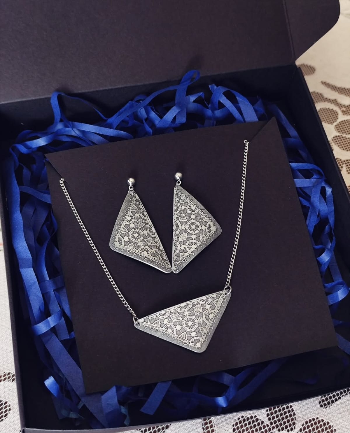 Ogrlica i naušnice u setu s motivom paške čipke izrađena specijalnom tehnikom sa slanom vodom (more) i električnom strujom. Materijal je visokokvalitetan aluminij 99,5 za privjesak i medicinski nehrđajući čelik 304 za lančić. Ukoliko izgubi sjaj, ispolirajte s maramicom za nakit. Dimenzije privjeska oko 3 cm. Dužina lančića oko 45 cm. Poštarina nije u cijeni.