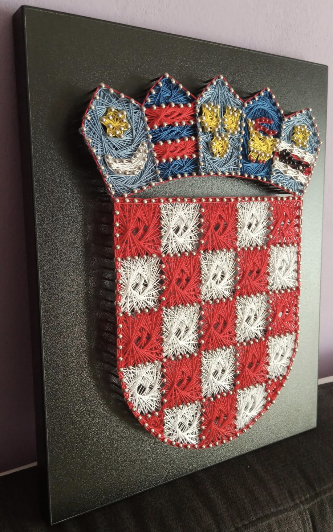 Bild mit String-Art-Technik erstellt. Kroatischer Wappen auf weißem Hintergrund. Größe: 26x32 cm. Lieferzeit: 1 Monat. Preis ohne Versandkosten.