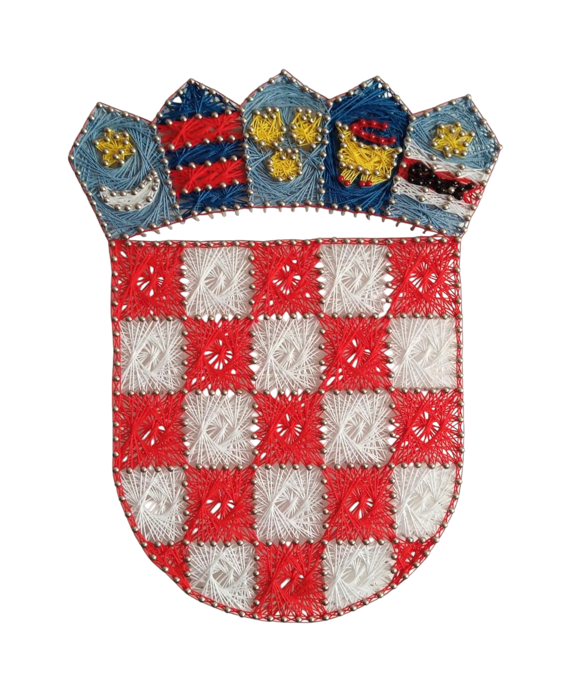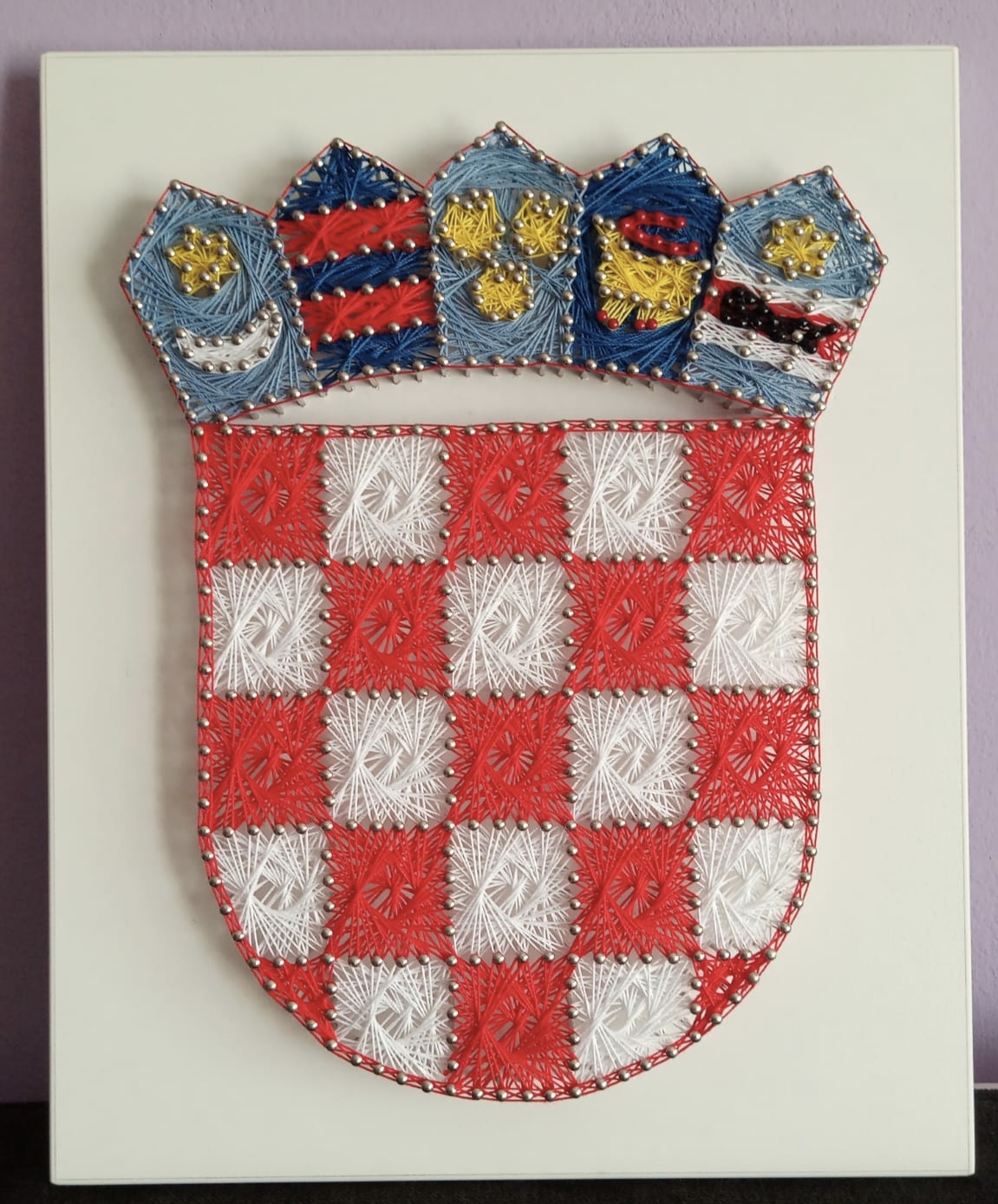 Bild mit String-Art-Technik erstellt. Kroatischer Wappen auf weißem Hintergrund. Größe: 26x32 cm. Lieferzeit: 1 Monat. Preis ohne Versandkosten.
