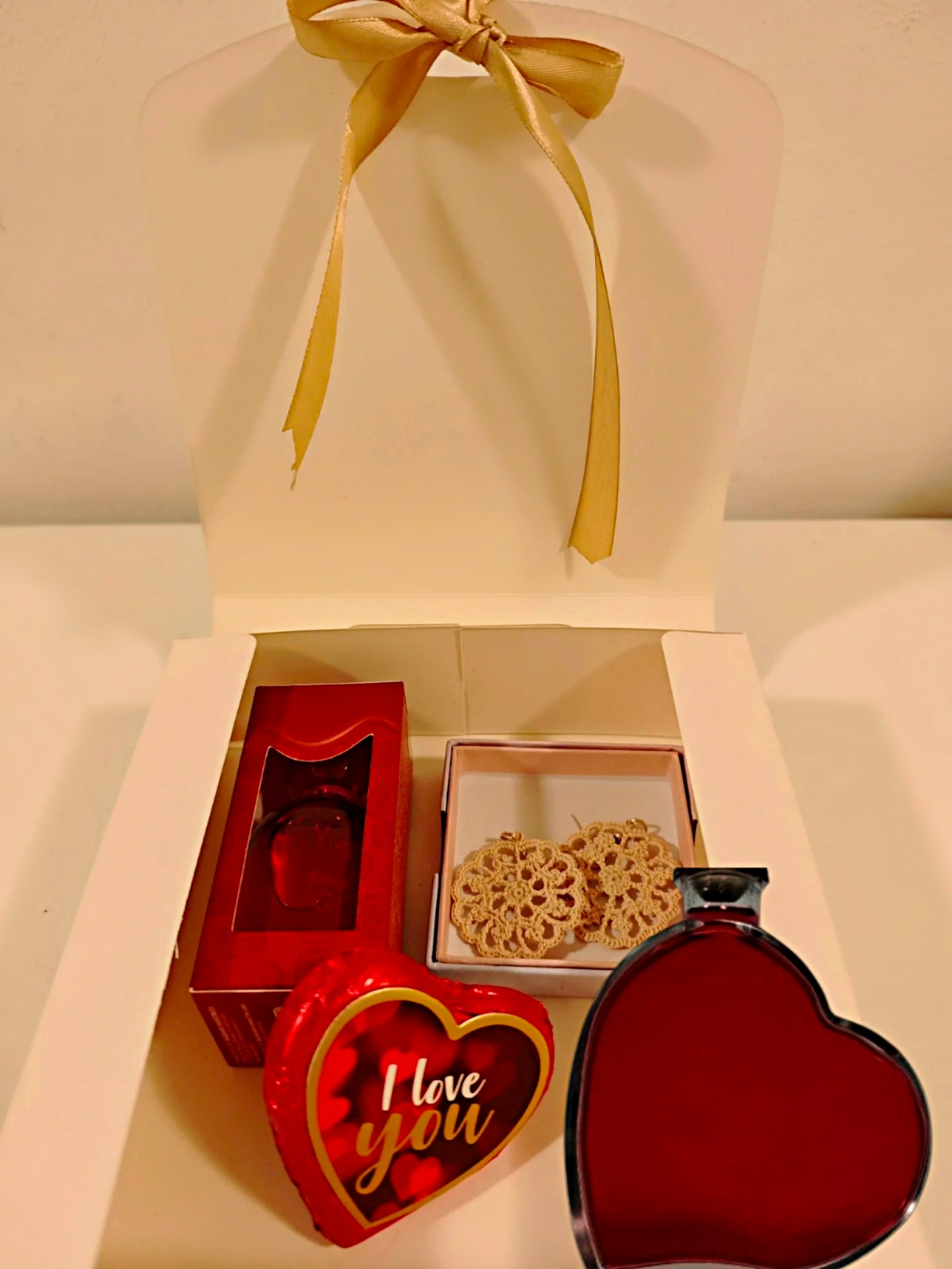 Gehäkelte Ohrringe. Hausgemachter Aronia-Likör. Schokolade mit Liebesbotschaft. Kleines Parfüm.